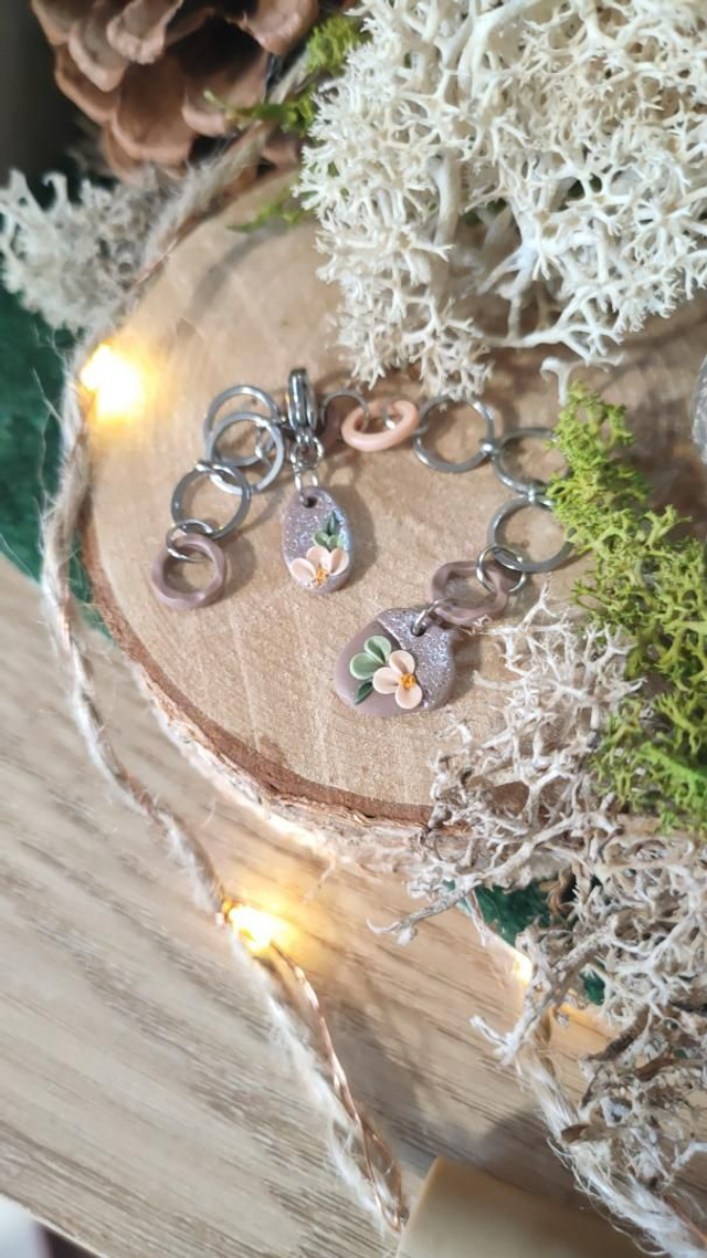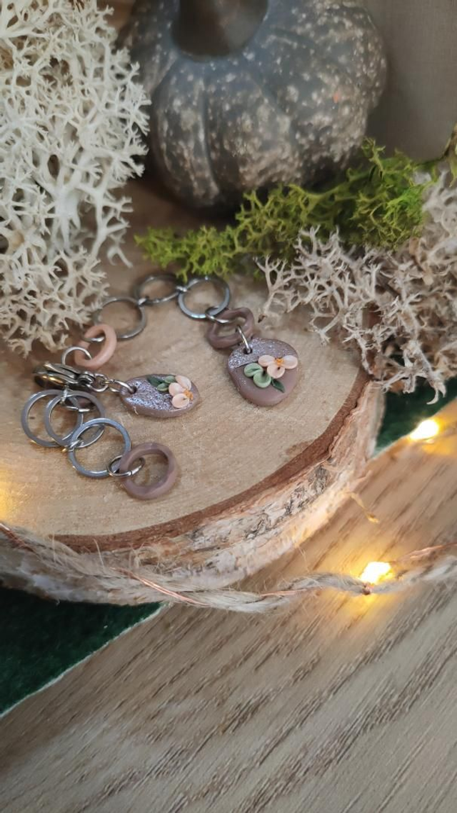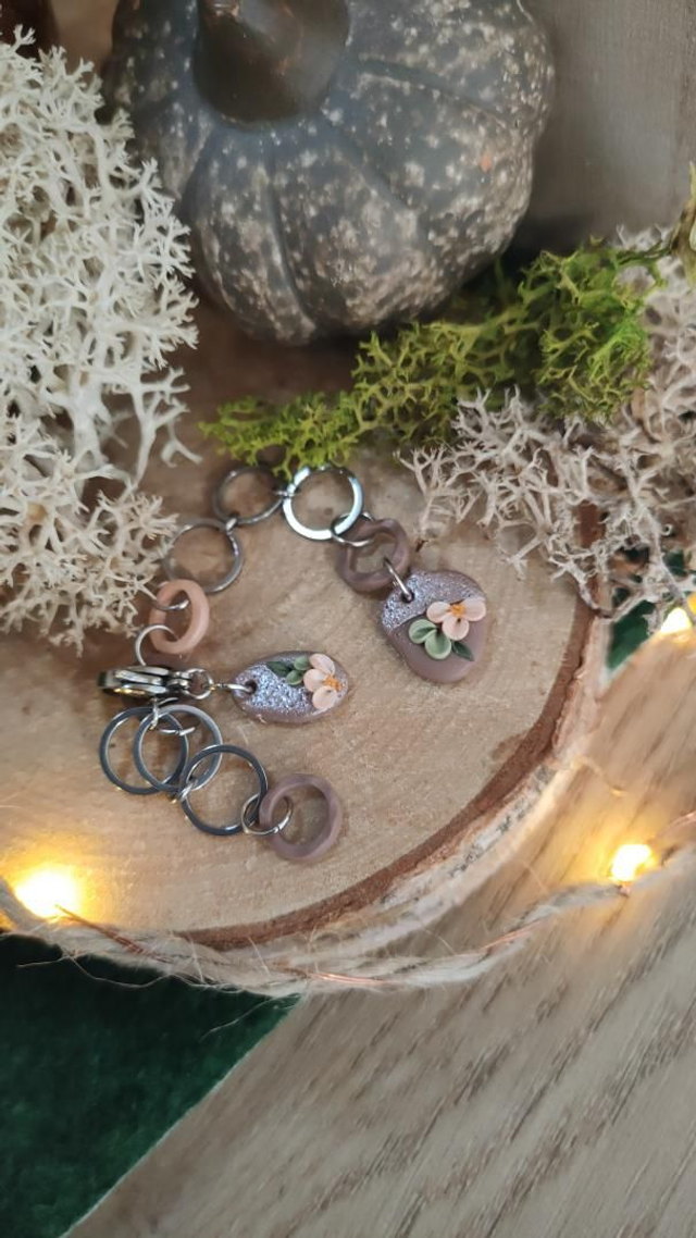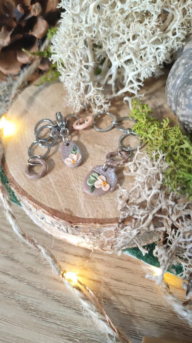 Compte-rang tricot réaliser à la main en argile polymère et assemblé avec des anneaux en acier inoxydable.