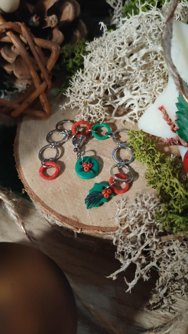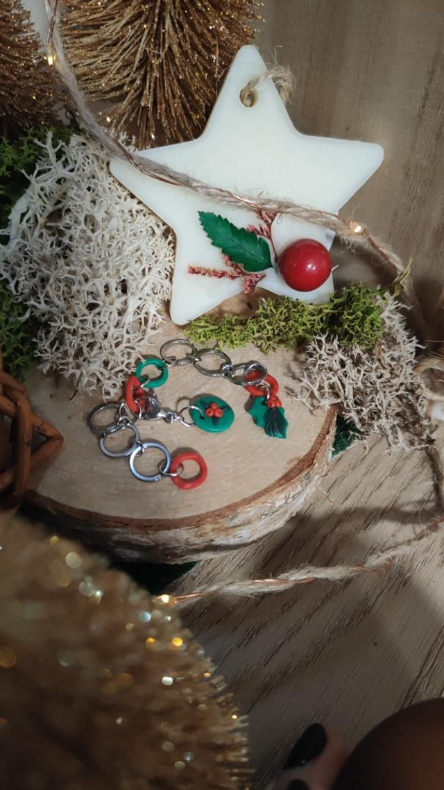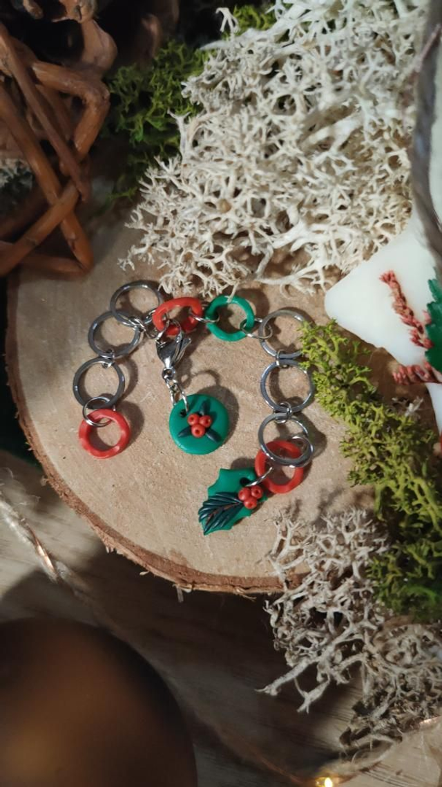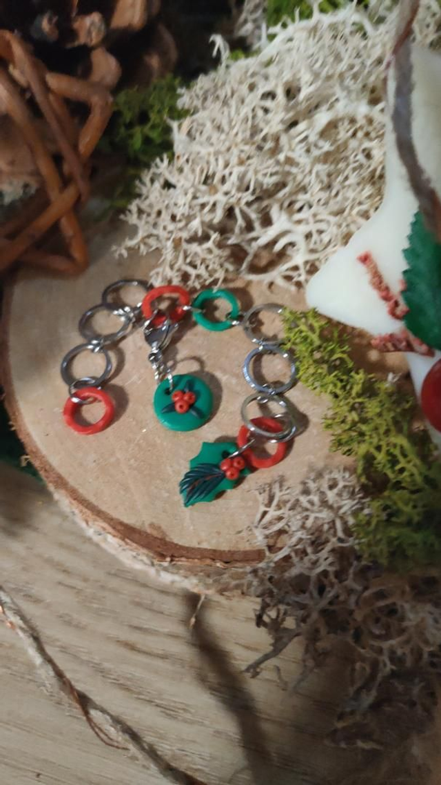 Compte-rang tricot réaliser à la main en argile polymère et assemblé avec des anneaux en acier inoxydable.