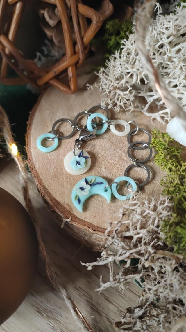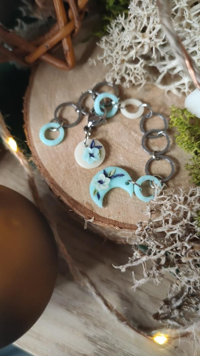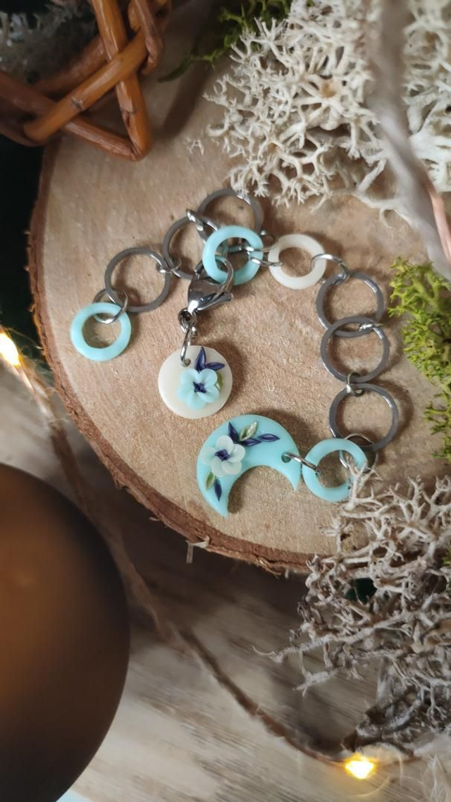Compte-rang tricot réaliser à la main en argile polymère et assemblé avec des anneaux en acier inoxydable.