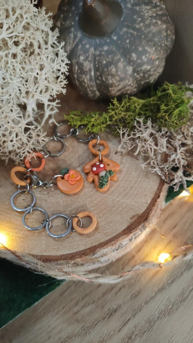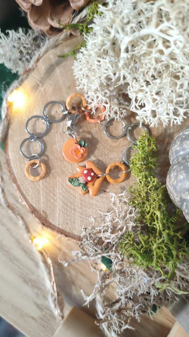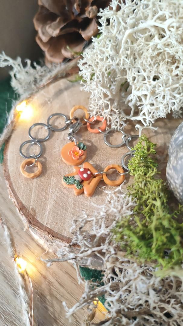 Compte-rang tricot réaliser à la main en argile polymère et assemblé avec des anneaux en acier inoxydable.