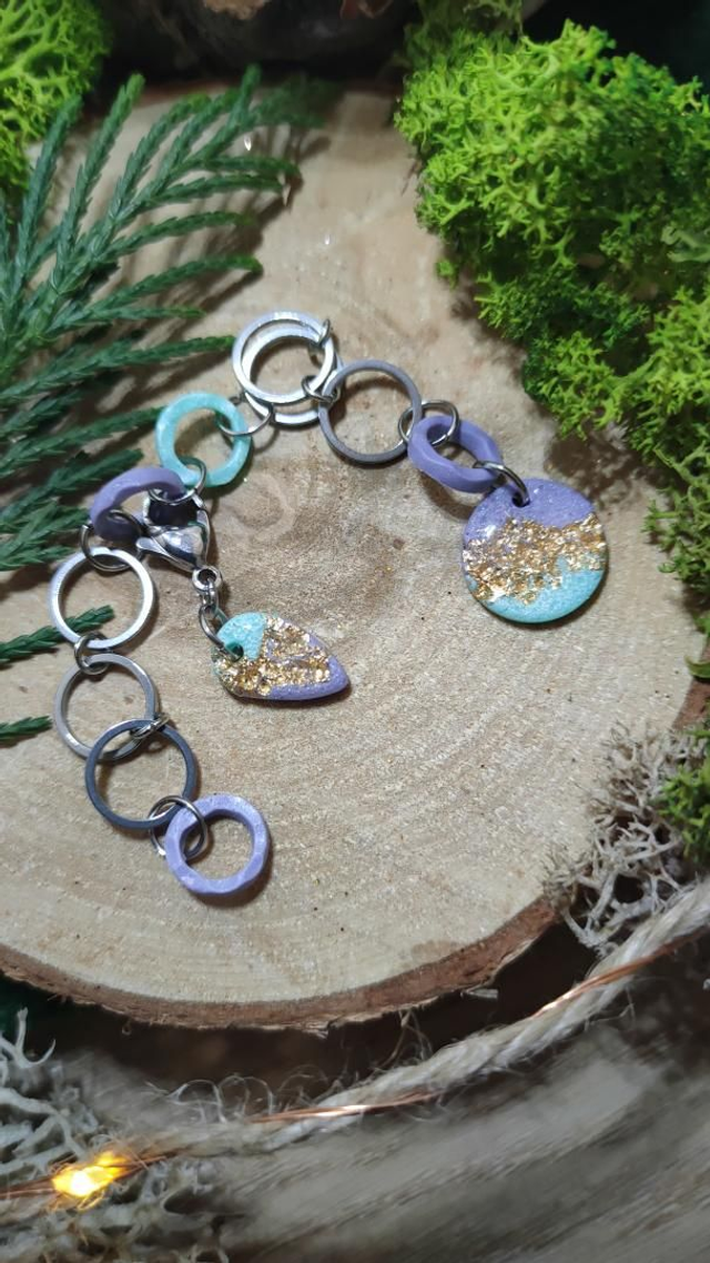 Compte-rang tricot réaliser à la main en argile polymère et assemblé avec des anneaux en acier inoxydable.