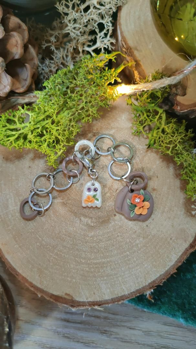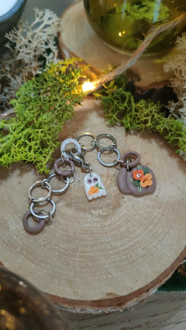 Compte-rang tricot réaliser à la main en argile polymère et assemblé avec des anneaux en acier inoxydable.