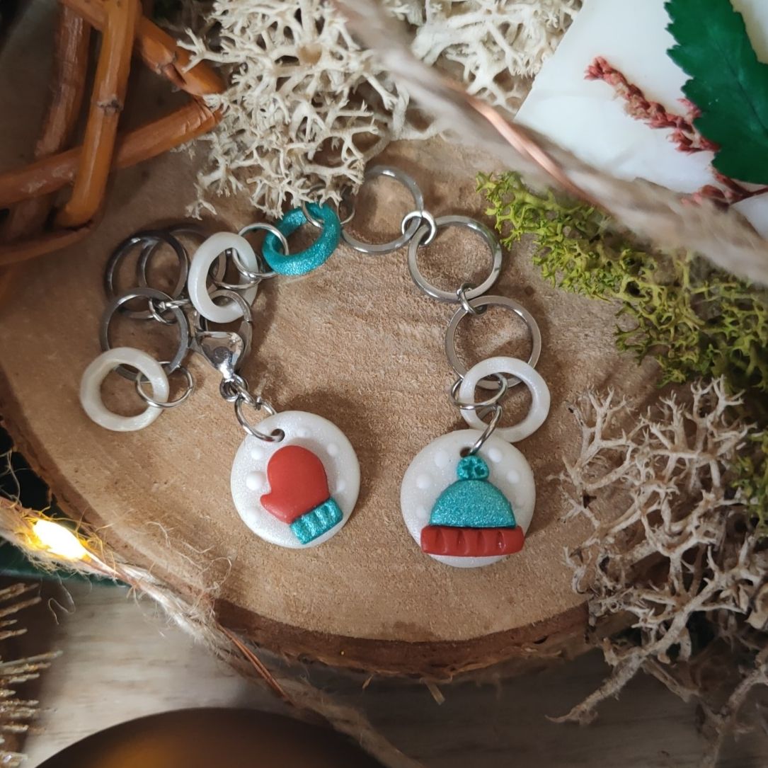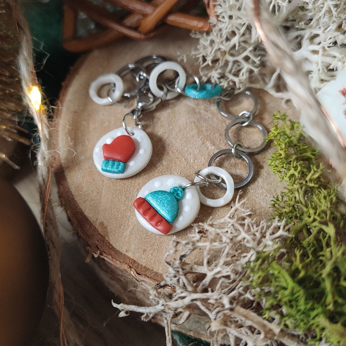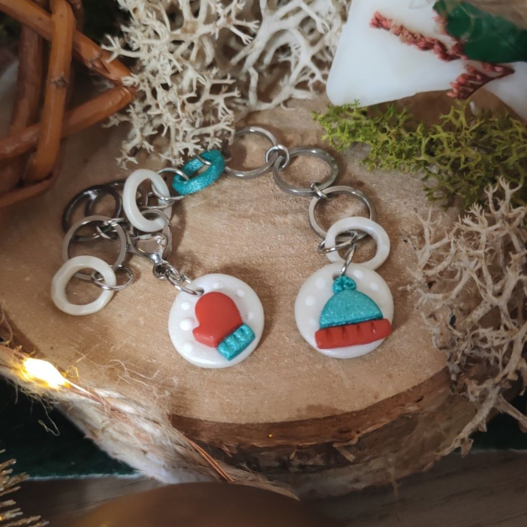 Compte-rang tricot réaliser à la main en argile polymère et assemblé avec des anneaux en acier inoxydable.