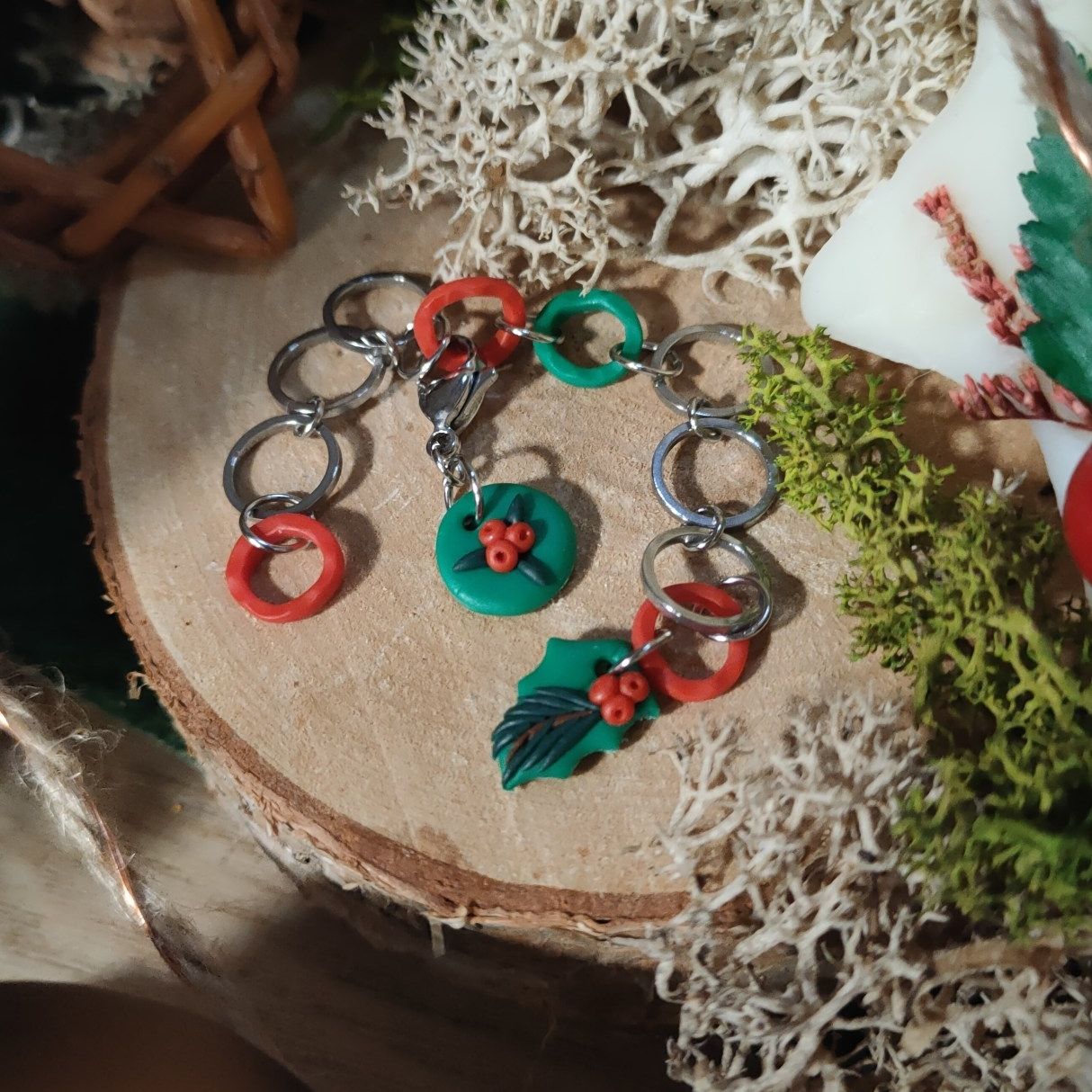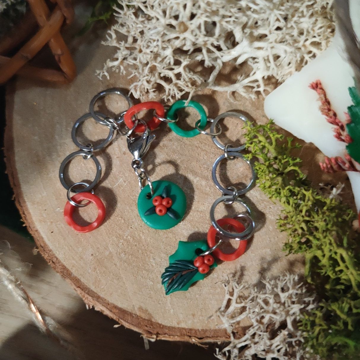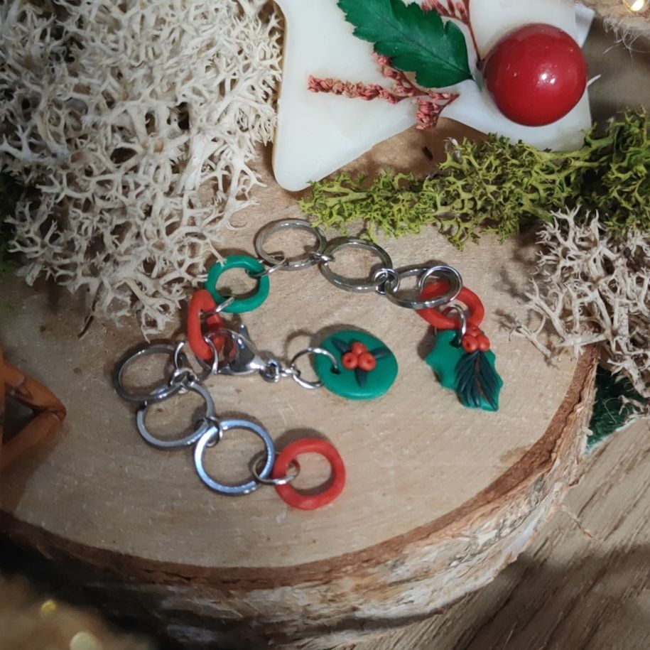 Compte-rang tricot réaliser à la main en argile polymère et assemblé avec des anneaux en acier inoxydable.
